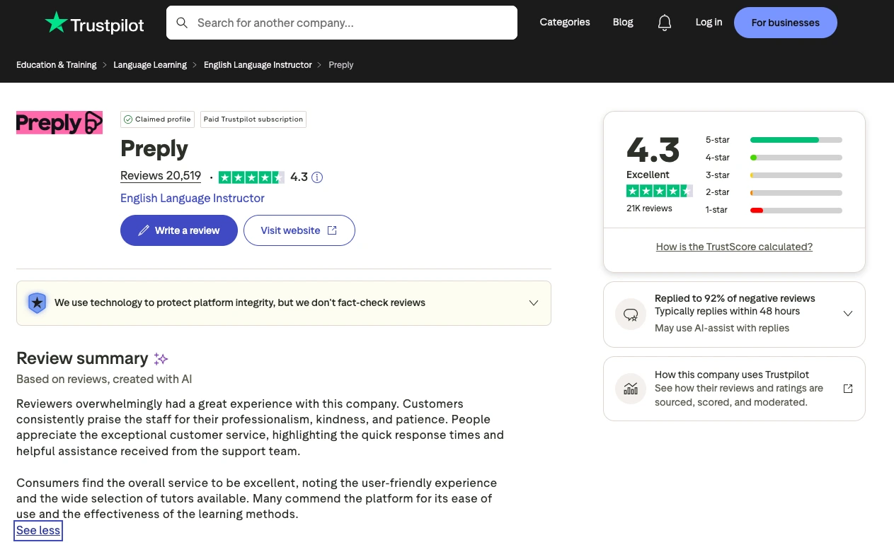 On Trustpilot, Preply shows a high score and a very large number of reviews. This is where many parents start. Source: Trustpilot’s preply.com reviews.