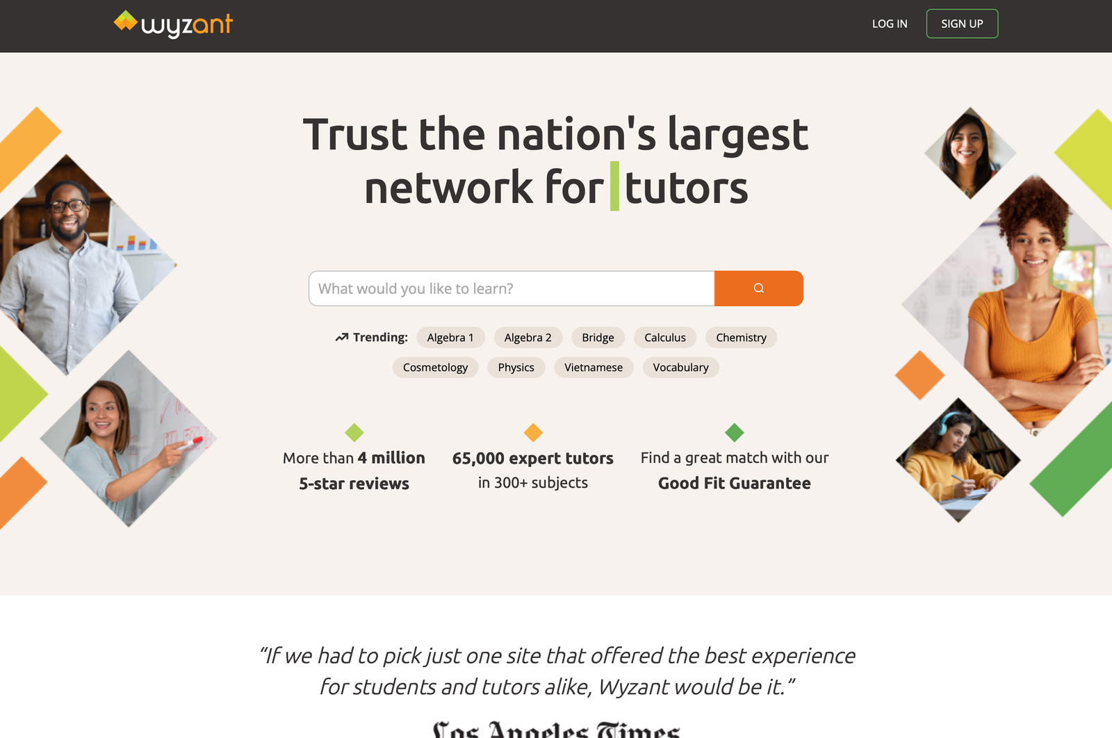 • Wyzant homepage screenshot with “Trust the nation’s largest network for Chemistry tutors,” subject search bar, trending subjects (including Physics), and tutor profile photos.