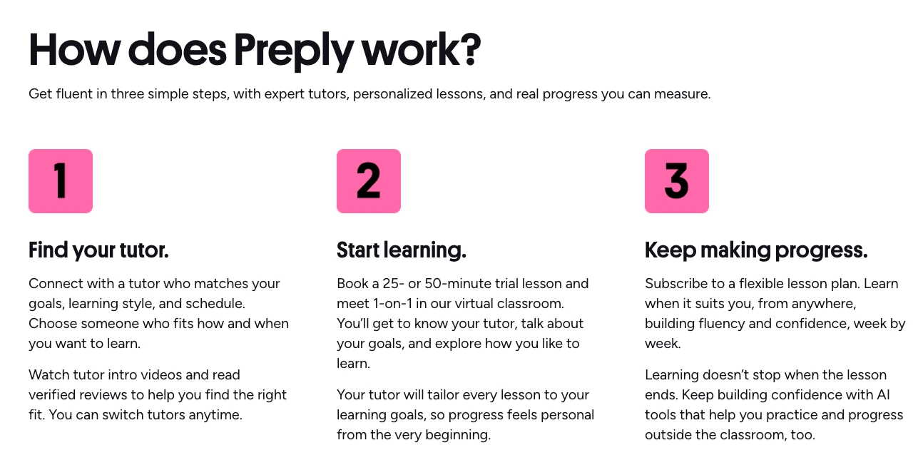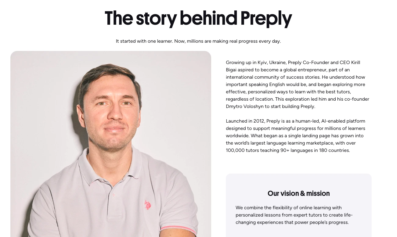 Background, founders, mission, scale : Preply describes itself as “human-led” and “AI-enabled” and says it has raised over $150M across major funding rounds. Source: Preply About us.