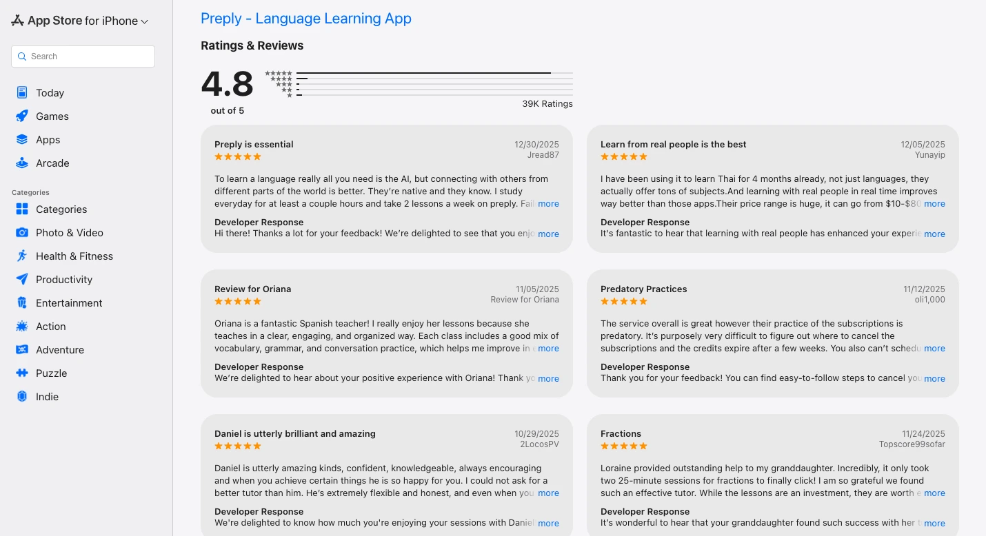 Some detailed reviews praise tutor quality and convenience. Some also complain about subscription management and credits. You can see these longer comments here: Preply iOS reviews page.